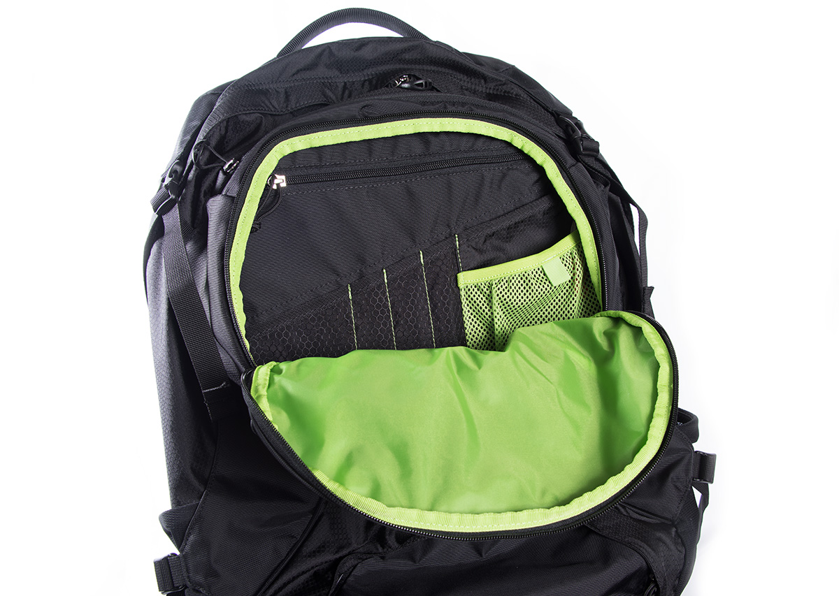 Inside the main compartment is a laptop pouch. This pouch will hold a 15" laptop with ease, you may be able to squeeze in a slightly larger laptop, but don't expect to get your 17" desktop replacement laptop into the pouch (for more reasons than one). One thing that I'm not sure about the laptop pouch is that it's on the back of the pack, so everything that you put into the pack will press against it. So if you plan on loading in heavy objects, you may want to make sure where they are positioned in the bag. You can also feel the laptop in the pack a little bit. I've used the pouch for my Lenovo Yoga 900, that is 13.3" and it worked out fine, no damage, etc. But that's also without really overloading the pack. So the laptop pouch works, but it's definitely not a shining feature of the pack. It's there and seems to work, but it definitely leaves some to be desired.
